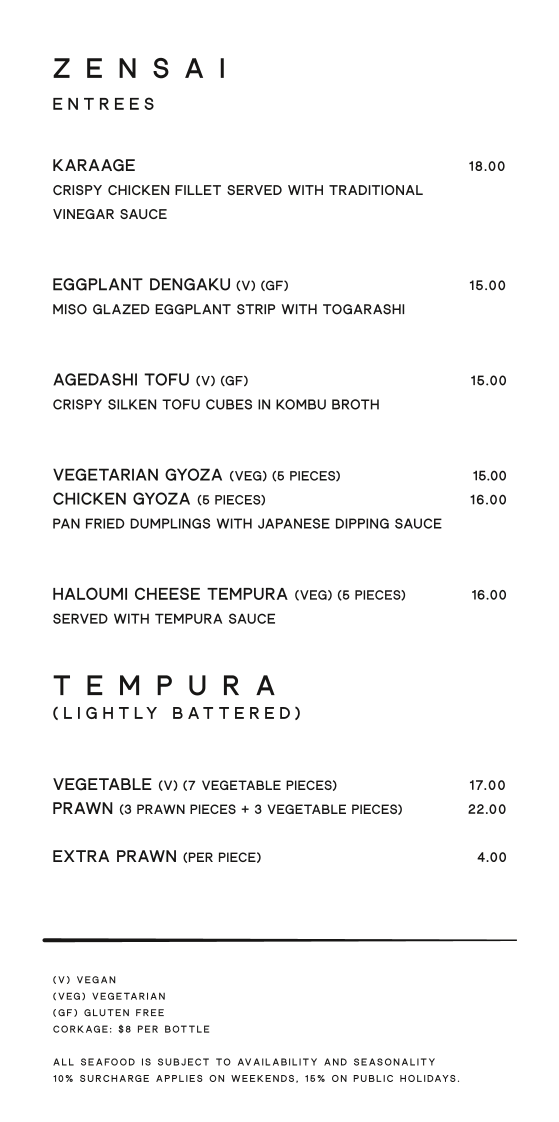 One highlight is the HOSOMAKI ROLLS, offering fresh options like Cucumber and Avocado for vegetarians, while seafood lovers can indulge in Fresh Salmon and Fresh Tuna rolls. For those looking to start their meal, the ZENSAI section features tantalizing dishes such as Karaage Crispy Chicken and Agedashi Tofu, both bursting with flavor.